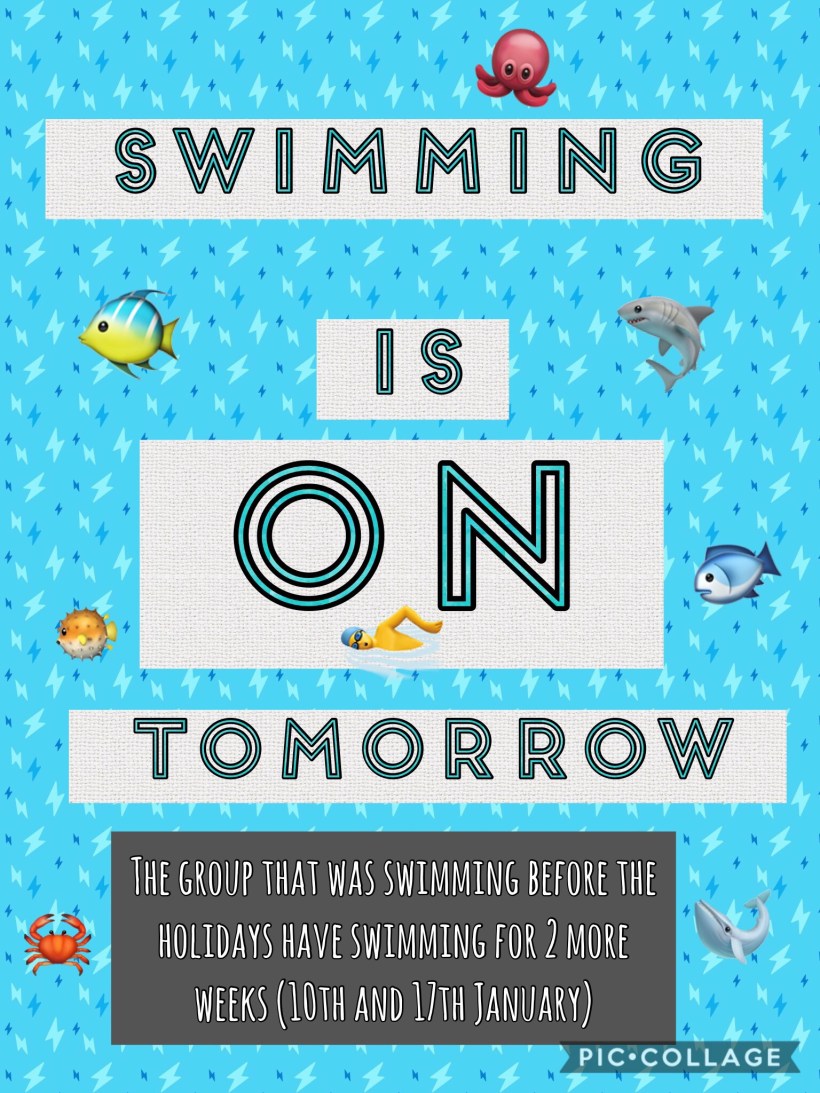 P6 Swimming tomorrow 10th January 09/01/2018 by mschadwick Leave a comment Please bring swimming kits 👍 Share this: Click to share on X (Opens in new window) X Click to share on Facebook (Opens in new window) Facebook Like Loading...