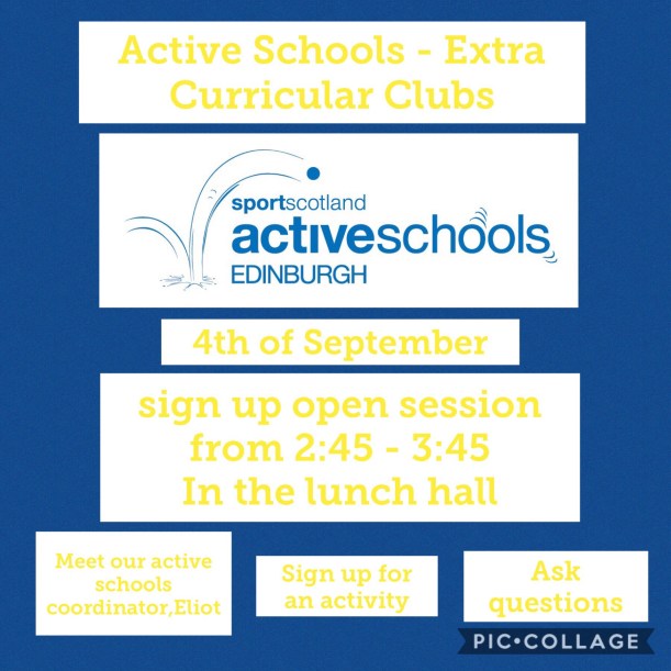 All Parents and Carers welcome to come along to our sign up session for Active Schools on Wednesday the 4th of September from 2:45-3:45 π